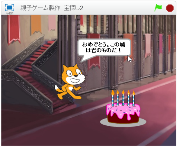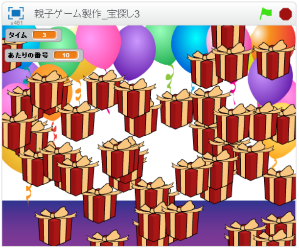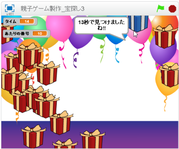 - レベル3はクローンを使います。クローンの機能を使って、たくさんの宝箱を出現させ、マウスを移動させマウスに触れると消えて行く or アタリの場合はコスチュームを切り替え〇〇秒で見つけましたね!!と表示させます。