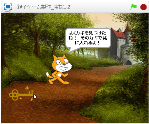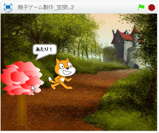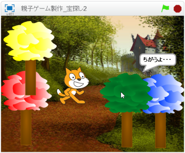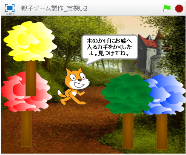 - レベル2はストーリーを持たせ、イベントによって場面(背景)が切り替わるようにしています。カラフルな木の裏にカギを隠しています。木のスプライトをクリックするとアタリかハズレかが分かります。