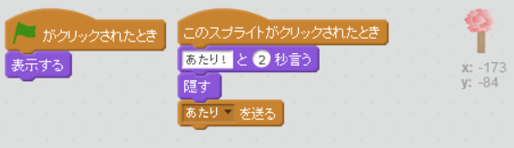 - このプログラムはクローンは使わず、3つのハズレ用スプライトと、1つのアタリ用スプライトを準備しています。ポイントは、スタートボタンを押したときにスプライトに初期のコスチュームをセットし、ハズレ用のスプライトがクリックされた時だけコスチュームを切り替えます。レベル1の場合、「このスプライトがクリックされたとき」のブロックの使い方が理解できれば難しくなく、後は工夫次第です!